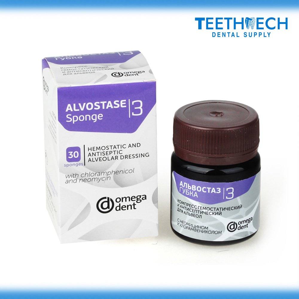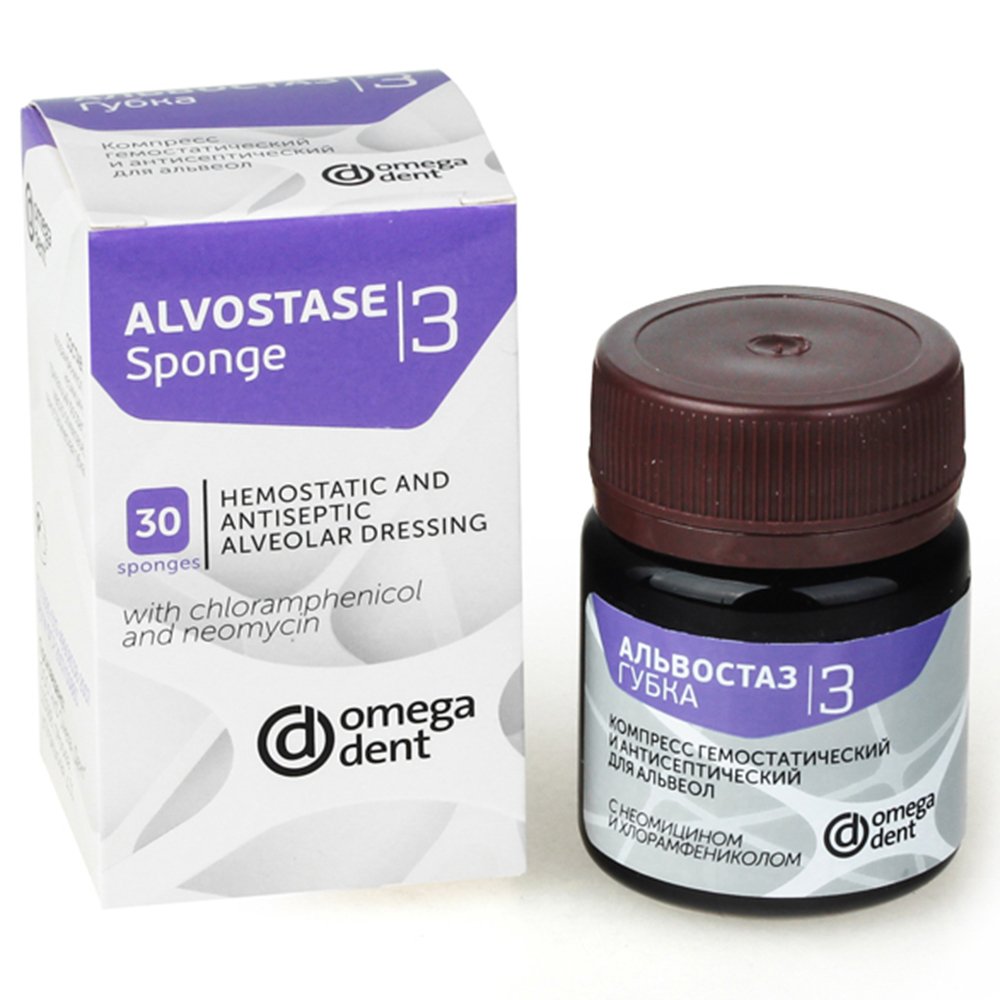 Alvostase (sponge №3) with chloramphenicol and neomycin is a special remedy for use in surgical dentistry and periodontology. Alvostase contains a combination of active ingredients having bactericidal effect that are active against most pathogenic organisms and causative agents of purulent infection. Alvostase (sponge №3) is active against bacteria strains, which are resistant to treatment with antibiotics such as penicillin, tetracyclines and sulfanilamides. Dexamethasone is a corticosteroid with that significantly reduces the quantity and severity of possible pained reactions.