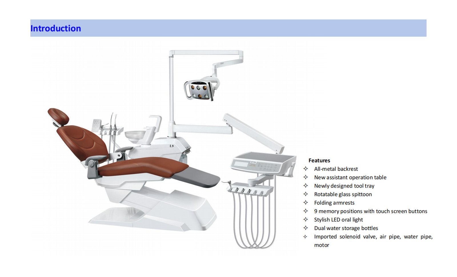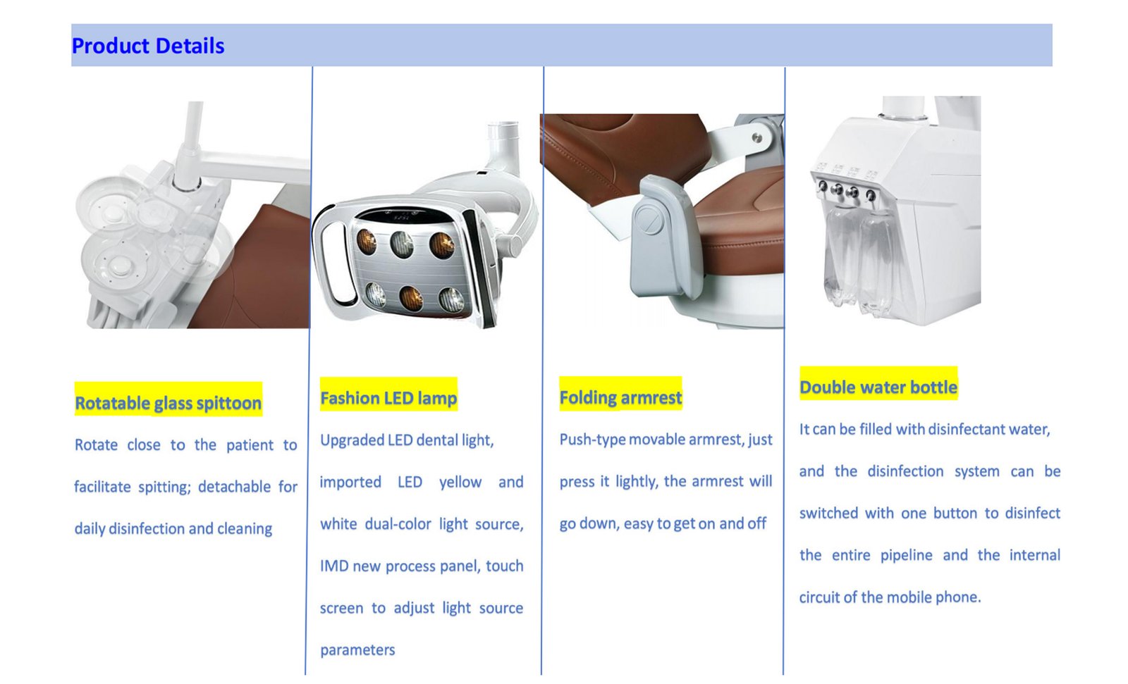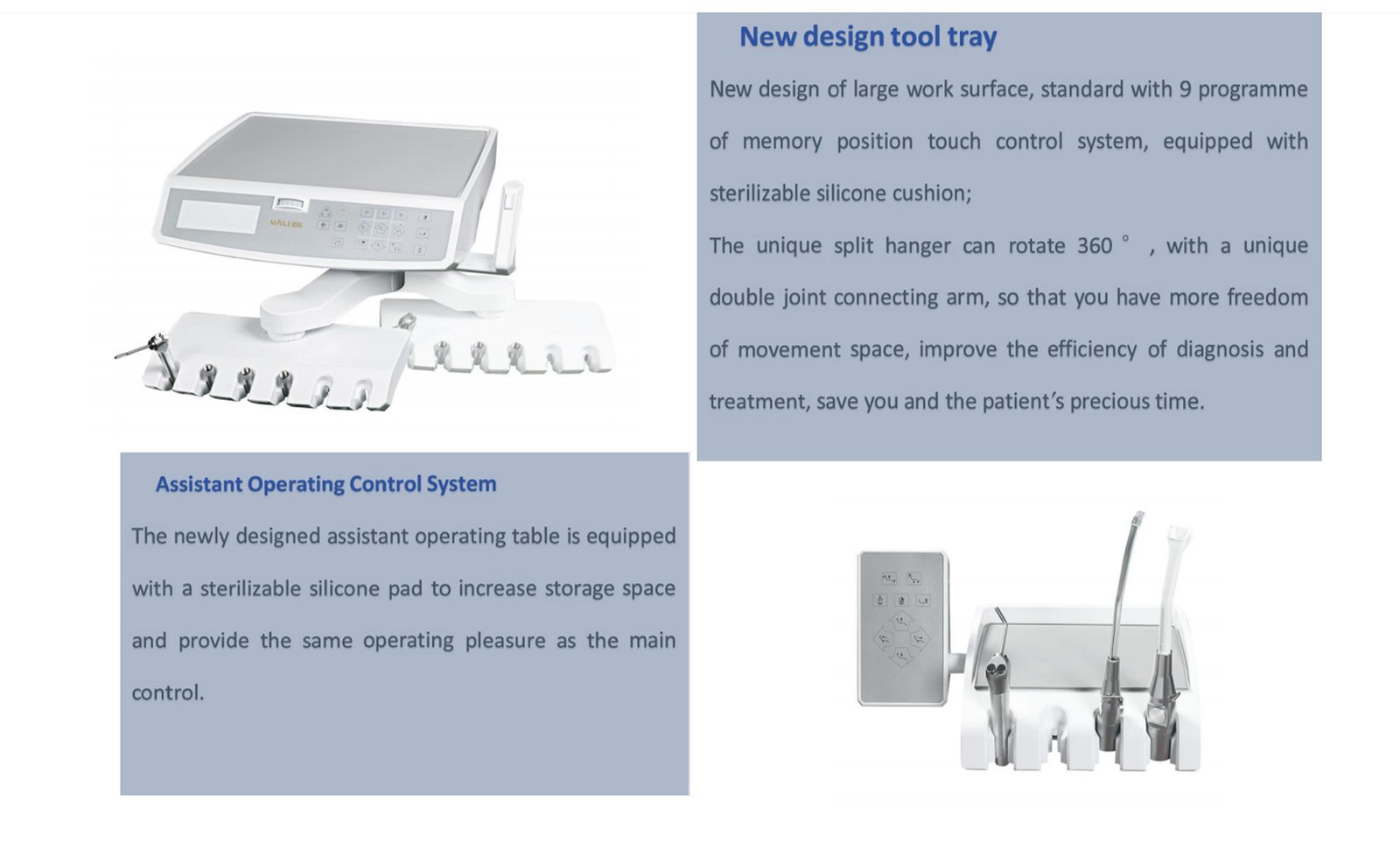 The new dual-color source 6-bead oral lamp maintains a stylish appearance while focusing on shadowless lighting; it can be controlled by induction or manually. The all-metal backrest is more solid, with a standard microfiber leather pad, which is soft and comfortable, and the wider, larger and more stable seat protects the patient; Imported water and air pipes, solenoid valves and motors increase the use time of the dental chair and eliminate quality worries; The oversized rotatable box, water and electricity separated assembly, is easy to repair and regular inspection; The double water storage bottle reduces the number of times the doctor stores water, saves time, and is clean and hygienic; The newly designed tool tray, novel and unique design, the mobile phone hanger can rotate 360 ​​degrees, saving the doctor time to adjust the tool during surgery and facilitating the doctor’s operation; 9 memory positions with touch screen buttons, convenient for multiple doctors to use at the same time; The new assistant console, the main control and the auxiliary control are equipped with sterilizable silicone pads, which are hygienic and convenient; The movable armrests are convenient for patients to get on and off.