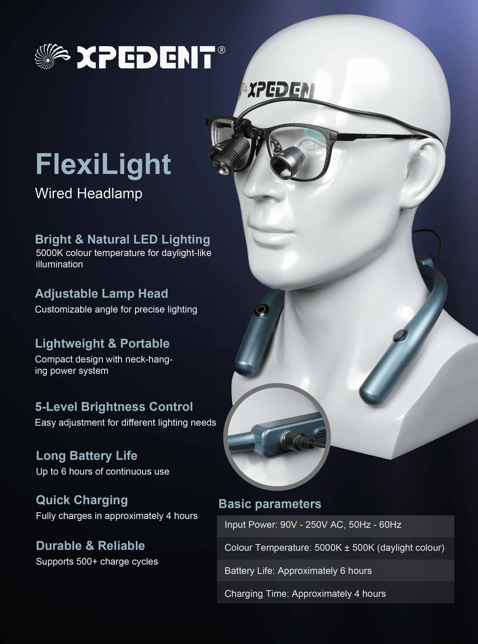 The Xpedent Flexilight Wired Headlamp is a high-powered, professional-grade lighting system designed for dental and surgical specialists who require long-lasting, consistent illumination throughout their workday. Built with a premium LED light source and adjustable brightness control, this headlamp provides up to 65,000 Lux of crystal-clear light for precise diagnosis, treatment, and surgical procedures.