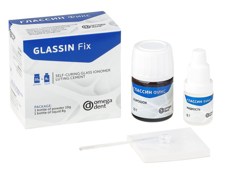 GlassIn Fix powder is a fine-dispersed aluminium-calcium-lanthanum-fluorosilicic glass with radiopaque additives. GlassIn Fix liquid is an aqueous solution of polyacrylic acid (with specified molecular weight) with organic additives improving its properties.
