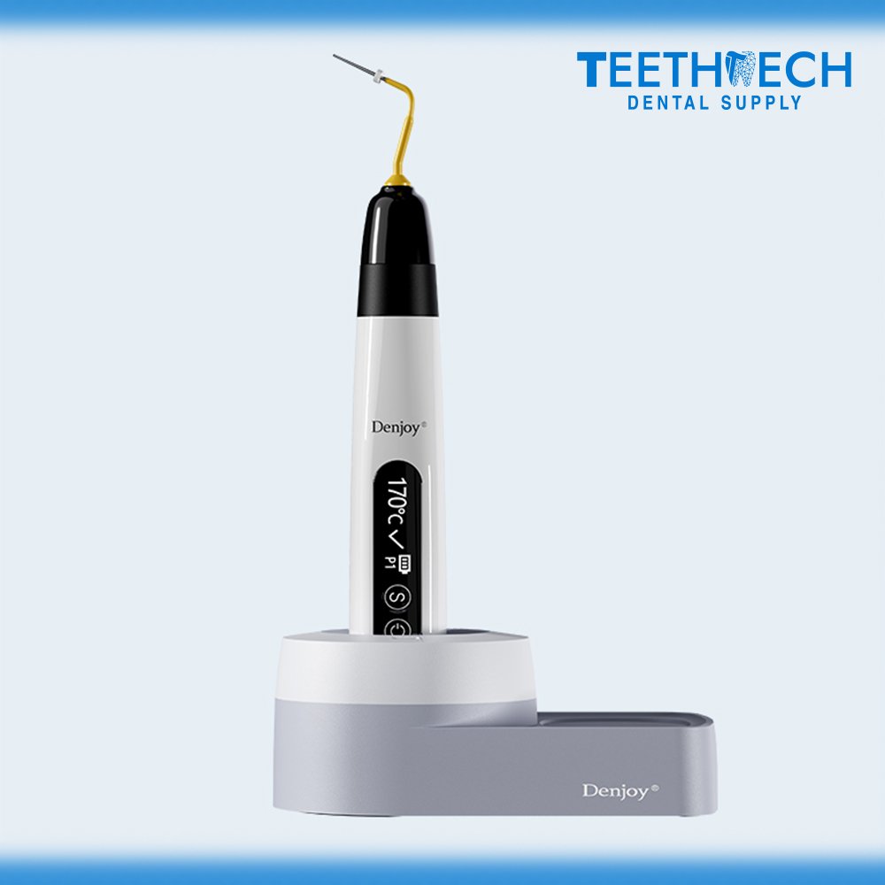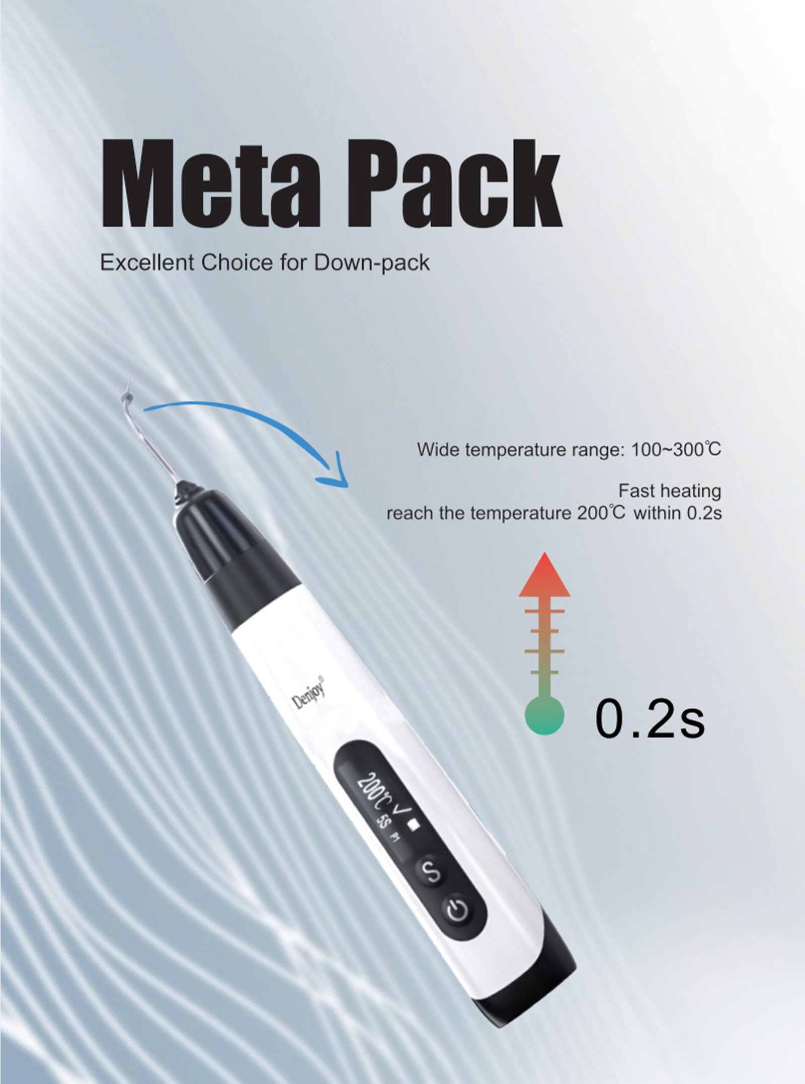 The Denjoy Meta Pack is a cordless and compact obturation device designed for the vertical compaction of gutta-percha during endodontic treatment. It provides quick and precise heating of the plugger tip, enabling smooth and efficient 3D filling of the root canal system. Whether used for warm vertical compaction or sectional filling techniques, this tool enhances clinical outcomes and reduces chair time.
