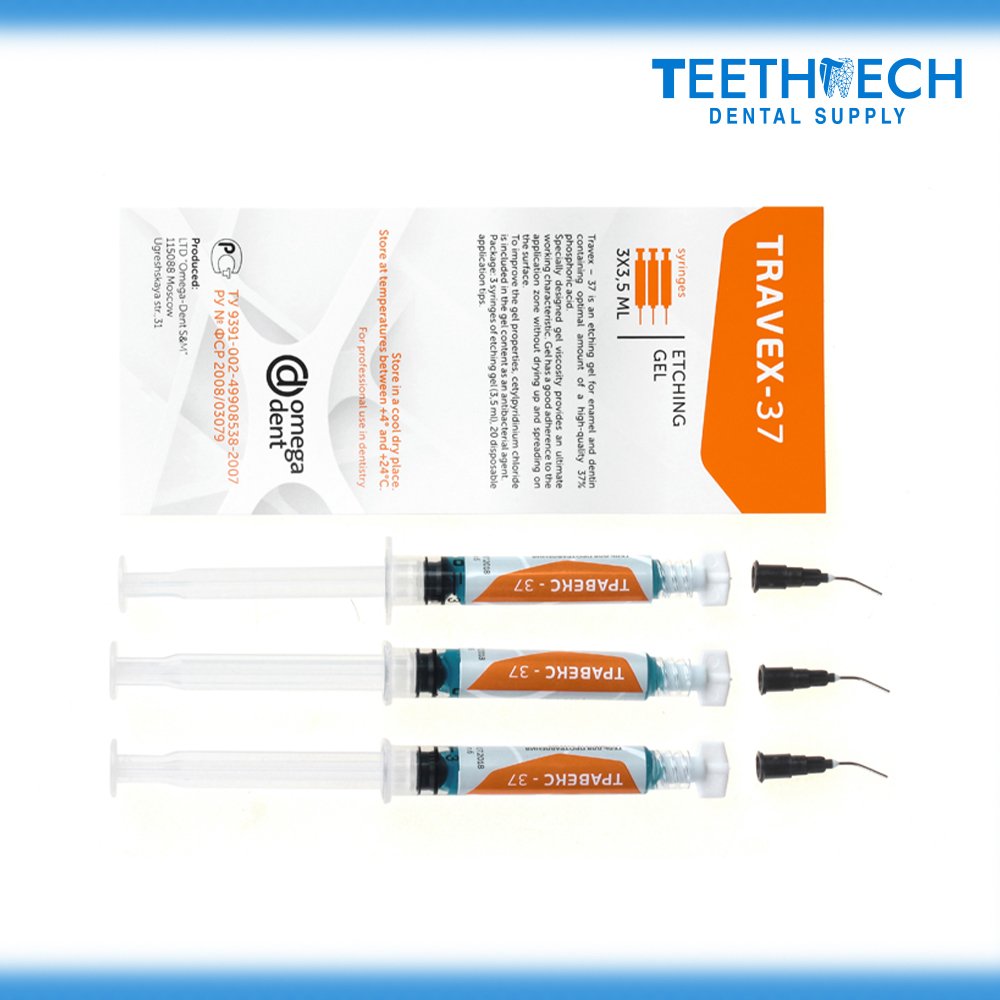 Omega Dent TRAVEX-37 is a 37% phosphoric acid etching gel designed for effective enamel and dentin conditioning to enhance adhesive bonding in dental procedures.